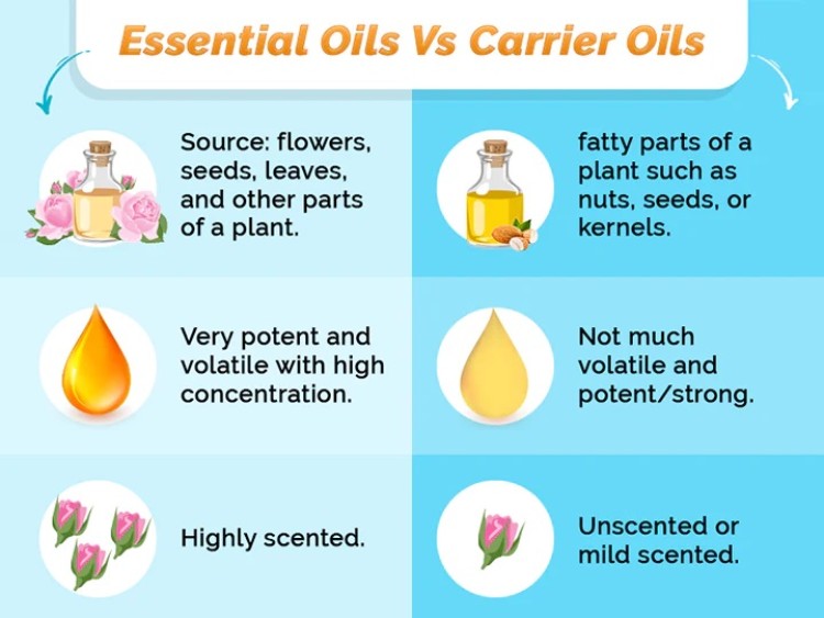 Essential oils are made through the distillation of the aromatic leaves, flowers, barks, and roots of plants. If applied directly to the skin, can cause reactions, such as severe irritation, flushing, or burning. Carrier oils dilute the essential oils and help “carry” them into the skin. People also sometimes use aloe vera gels and unscented body lotions as carriers. Carrier oils are usually vegetable oils, such as coconut oil or avocado oil, derived from the seeds, kernels, or nuts of a plant.