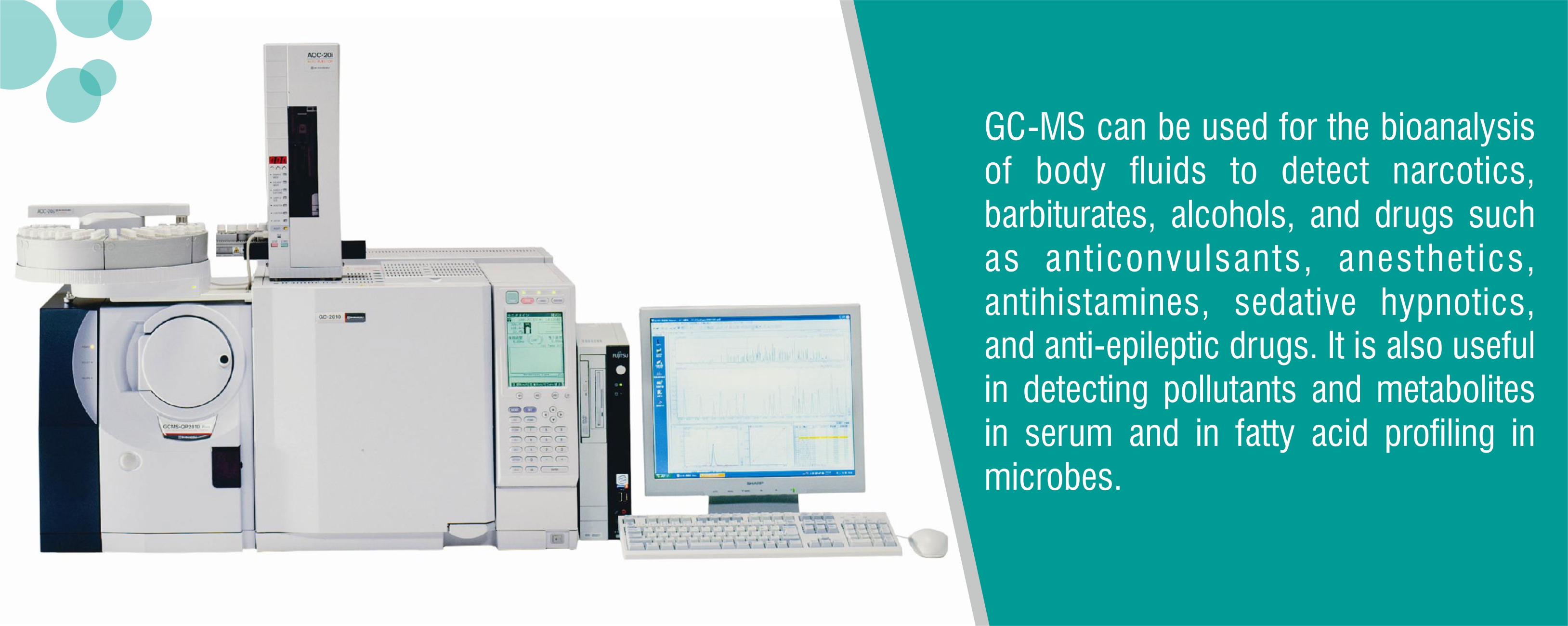 GC-MS can be used for the bioanalysis of body fluids to detect narcotics, barbiturates, alcohols, and drugs such as anticonvulsants, anesthetics, antihistamines, sedative hypnotics, and anti-epileptic drugs. It is also useful in detecting pollutants and metabolites in serum and in fatty acid profiling in microbes.