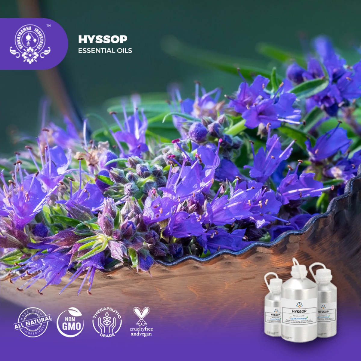 The mild and gentle Hyssop essential oil is extracted by steam distillation of leaves and flowers of Hyssopus officinalis L. flowers look similar to lavender and are staple folk medicine in European countries and Slovenia.