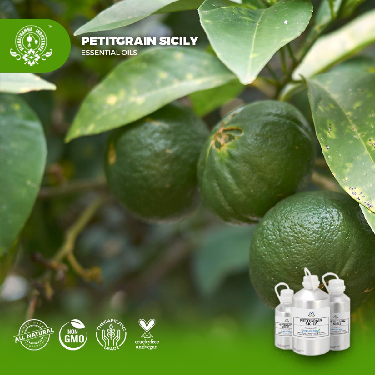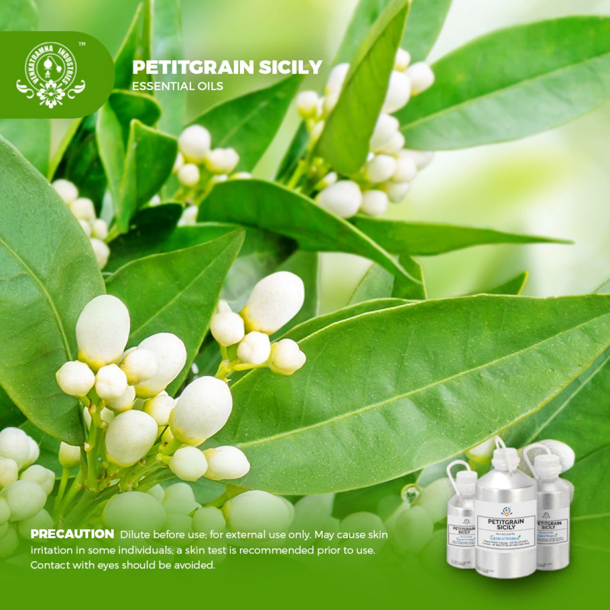 Petitgrain Sicily essential oil is produced by steam distillation of leaves and twigs.