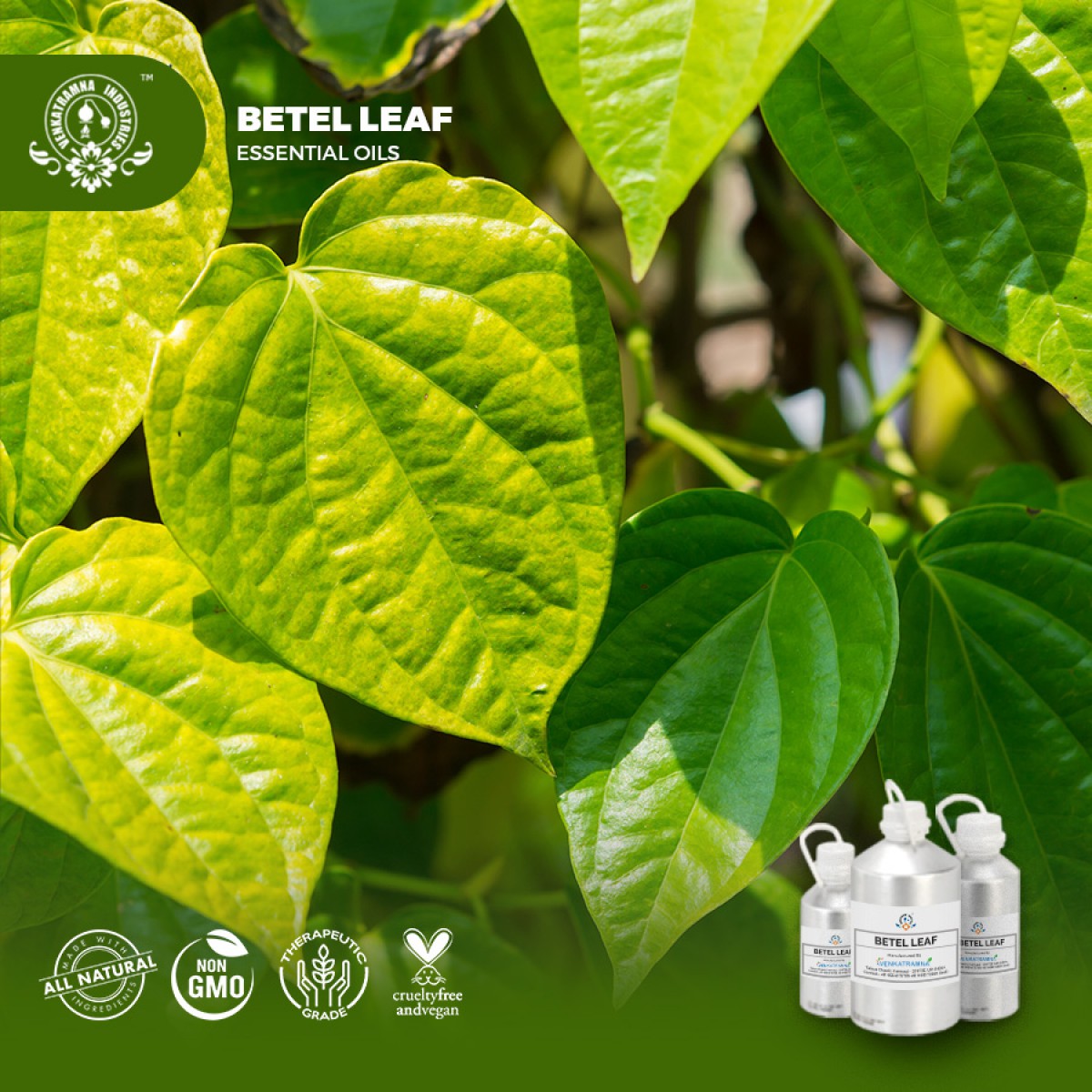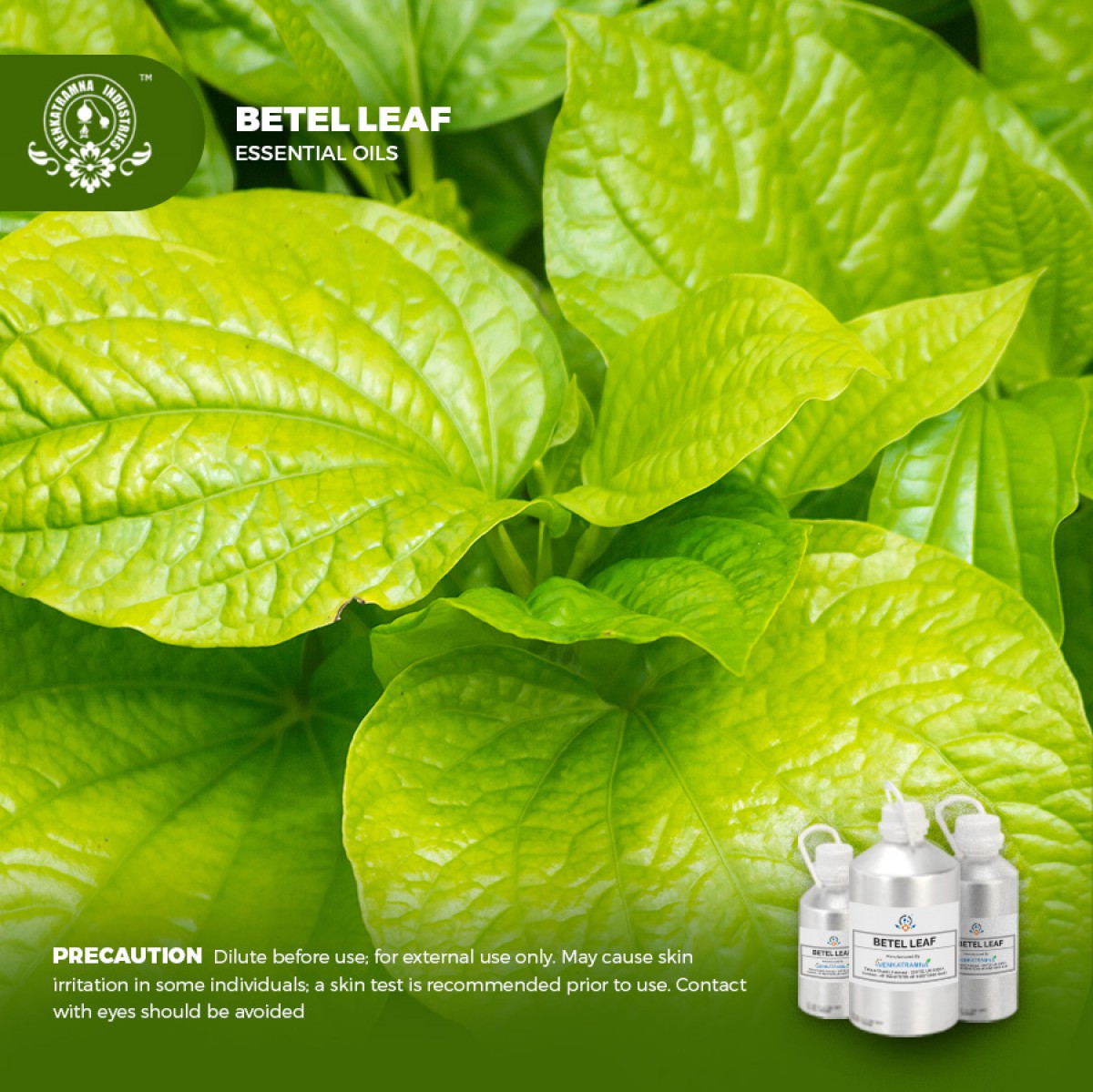Betel leaf oil derived from betel leaf plant leaves that yield this aromatic essential oil. The heart-shaped leaves have distinct pleasant aroma and are commonly chewed alone or with other plant materials.
