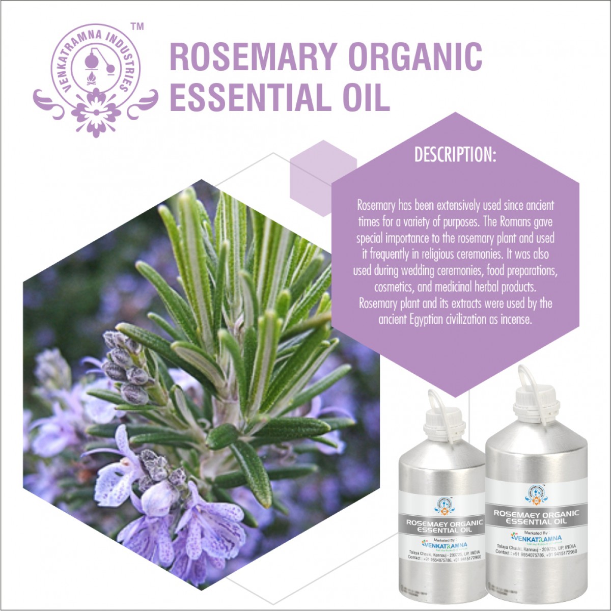 Rosmarinus officinalis, also known as rosemary, is an aromatic plant which belongs to the Lamiaceae family and is native to the Mediterranean region. Rosemary essential oil is produced by steam distillation from the flowering tips of the plant yielding a colorless to pale yellow liquid with a strong, warm, woody, balsamic aroma.