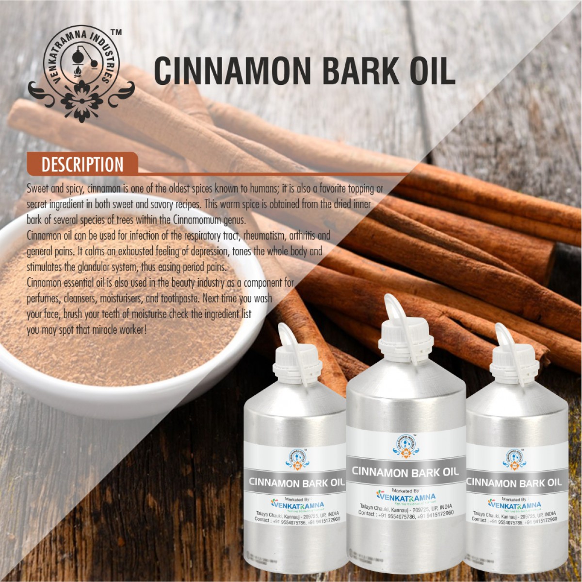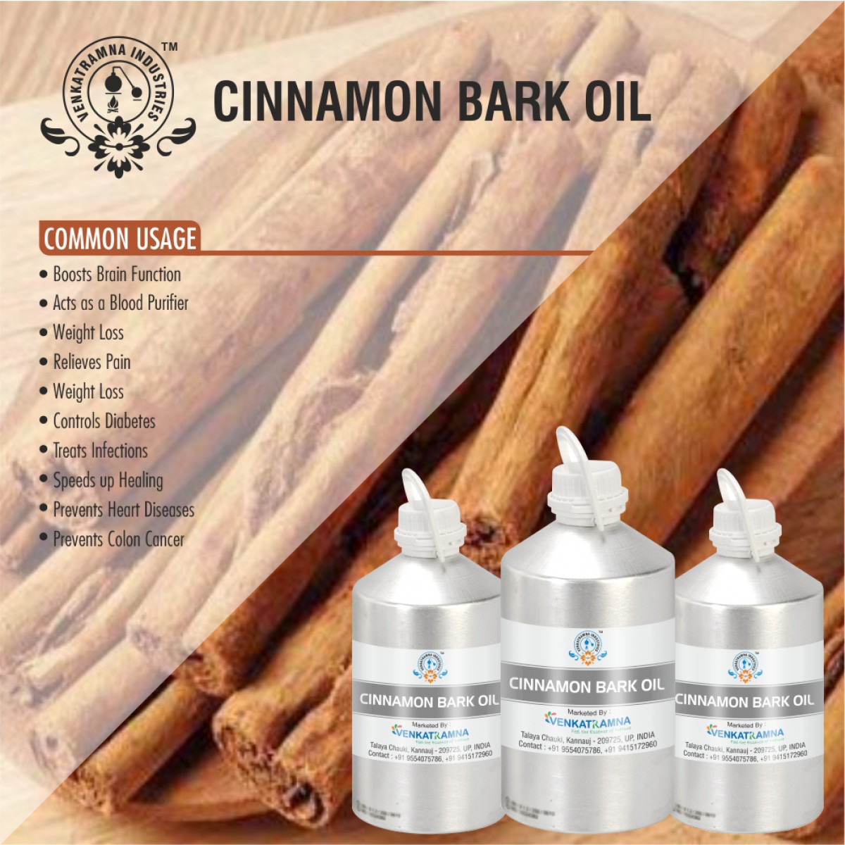 Essential oils of cinnamon bark and leaf are widely used in food flavours, cosmetics and pharmaceuticals. Cinnamon is mainly used in the aroma and essence industries due to its fragrance, which can be incorporated into different varieties of foodstuffs, perfumes, and medicinal products. The Oil is rich in monoterpenoids and phenyl propanoids. (E)-Cinnamaldehyde is the main component of cinnamon bark oil and eugenol the main component of the leaf oil. Benzyl benzoate chemotypes of cinnamon bark and leaf oils and linalool chemotype of cinnamon leaf oil were also reported. Essential oils of other parts such as fruit, fruit stalk, flower, bud, leaf petiole of cinnamon have also reported having medicinal and pharmacological benefits.