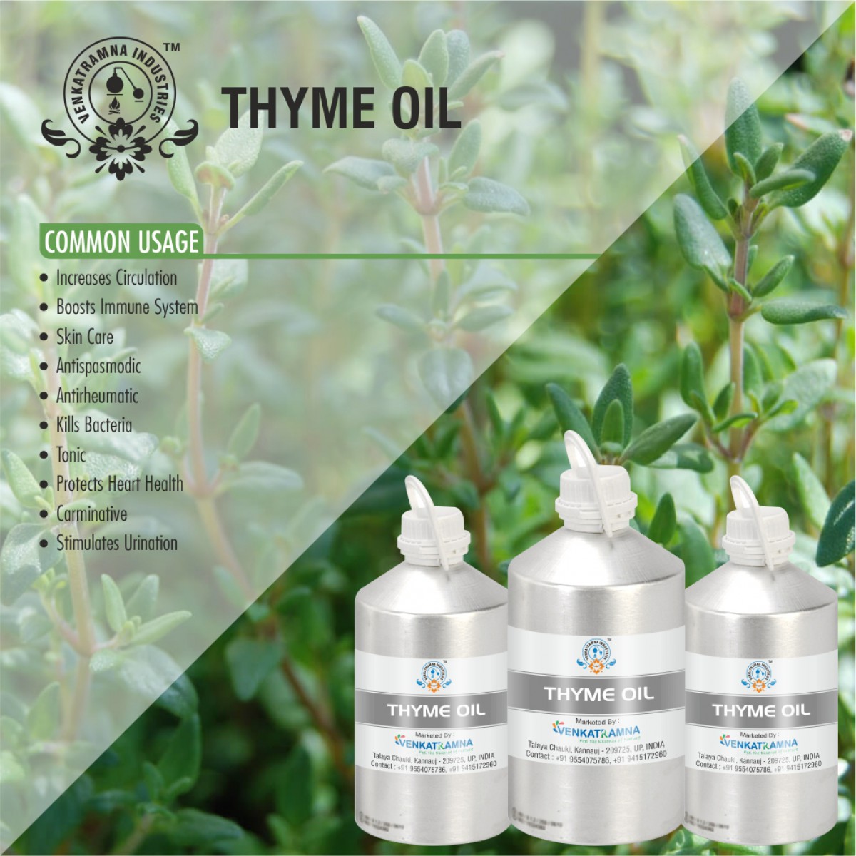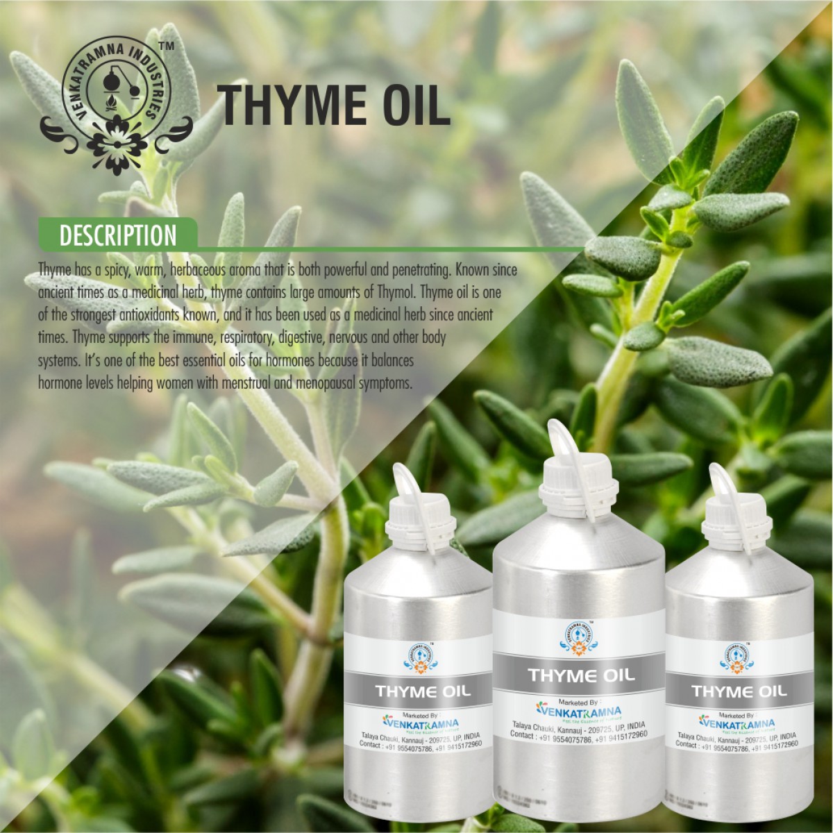 Volatile oils of thyme are among the main essential oils used in the food industry and in cosmetics as preservatives and antioxidants and as spice, home remedy, drug, perfume, and insecticide