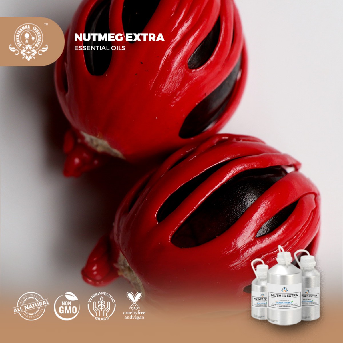 It exudes a warming, relaxing, spicy aroma that energizes mind as well as deeply soothe senses. Its ability to cure muscle contractions and pains owns to the sedative nature. For this reason, Nutmeg essential oil is commonly featured in medicinal and aroma therapeutic remedies for treating muscular aches and cramps, insomnia, and anxiety. Nutmeg oil is also known as an effective anti-inflammatory agent. It is industrially used in perfumeries and pharmaceuticals.