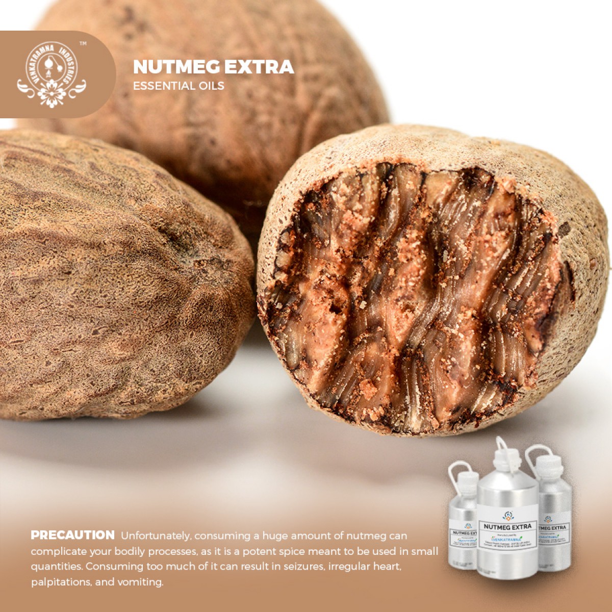 Nutmeg essential oil has extensive uses in food industry for preparing baked, beverages, syrups and sweets. The sweet spicy flavour aids for this application.