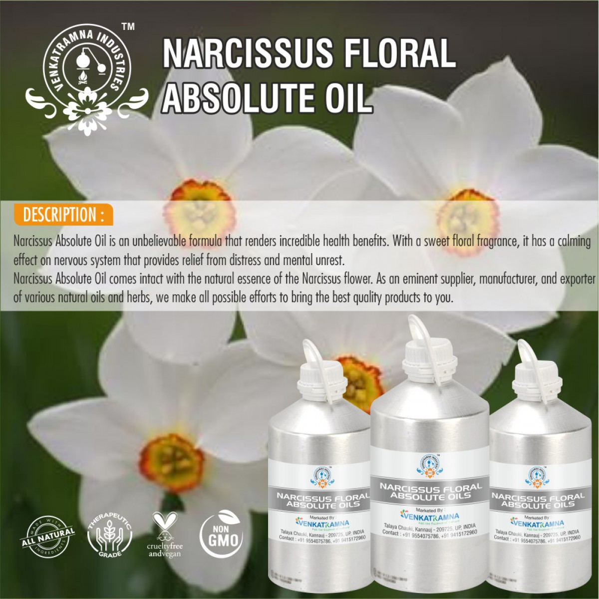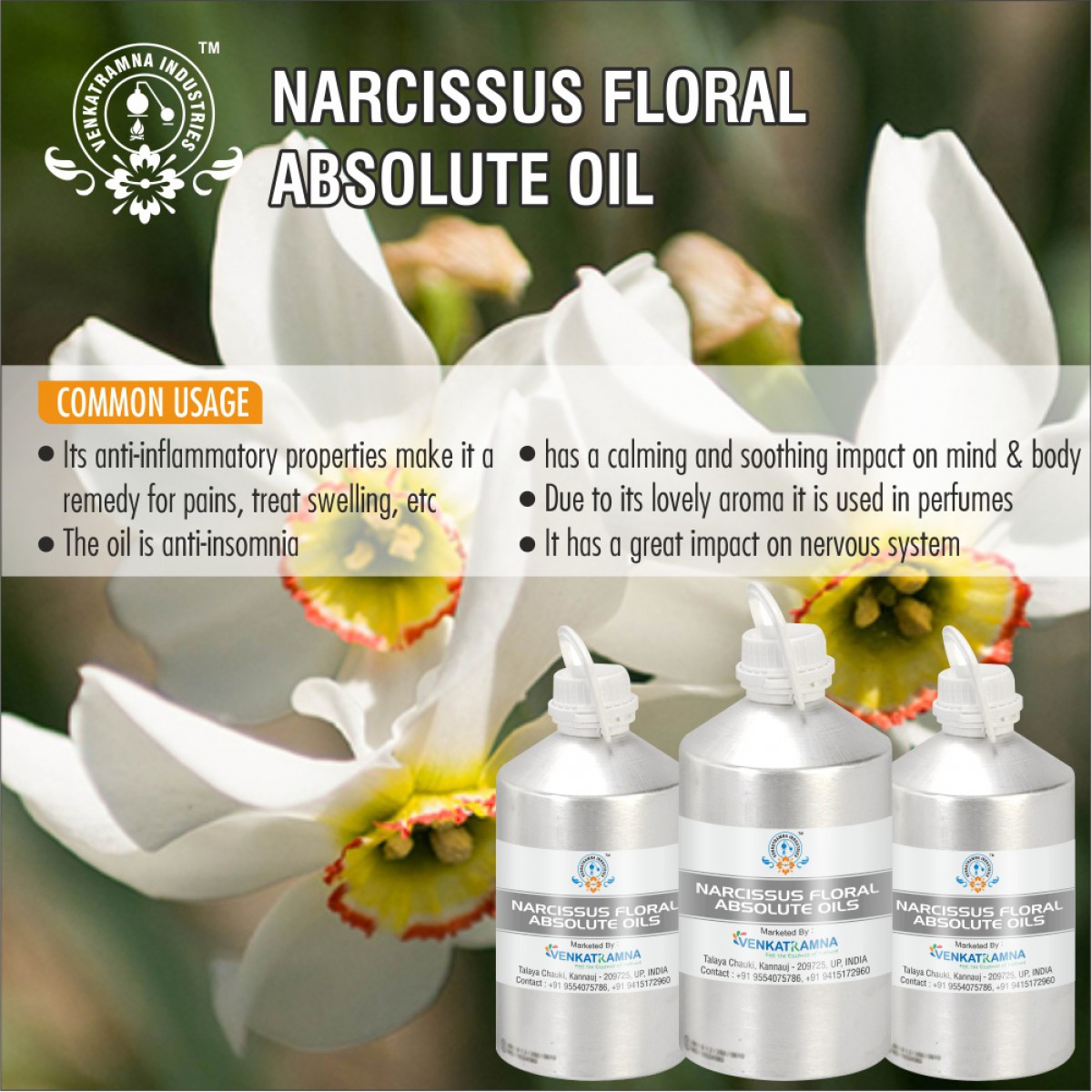 · It has used in cosmetics as additive to powders, soaps & lipsticks. This oil as an aphrodisiac and a cure for baldness, Used in high-class perfumery. The soothing and stimulating effect of Narcissus Absolute Oil reduces spasms of digestive, respiratory and nervous systems.