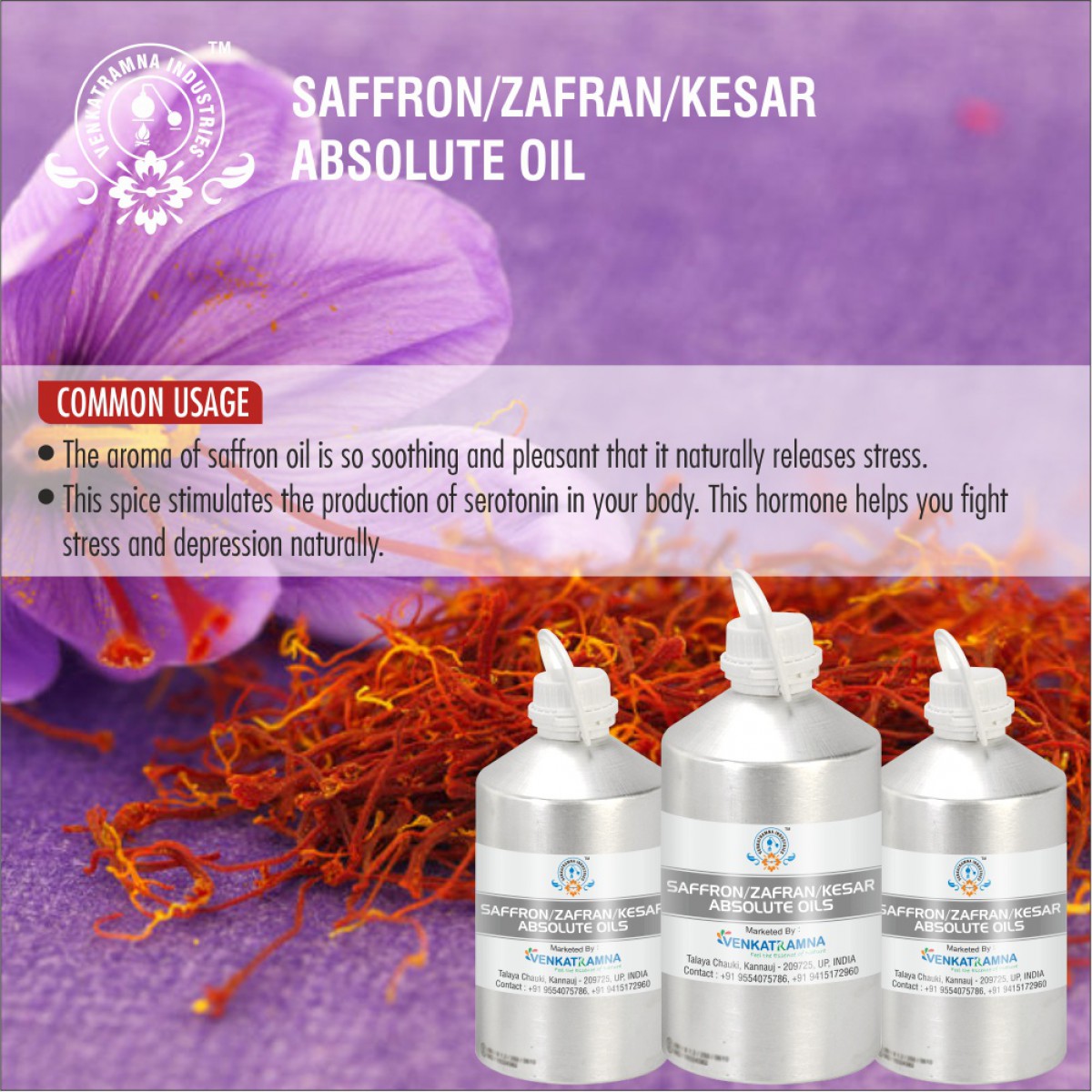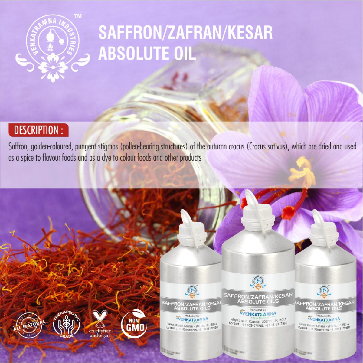 In general, saffron tastes bitter (presence of picrocrocin) and has a penetrating hay-like odor (presence of safranal). The presence of crocin (carotenoid pigment) gives a rich golden yellow color to textiles and foods upon treatment with saffron. Saffron oil is prepared from a flower’s stigma by solvent extraction; the oil has almost the same characteristics as the spice. Saffron oil contains more than 150 volatile and aroma-yielding compounds. Volatile components with a very strong odor are mainly terpenes, terpene alcohols, and esters.