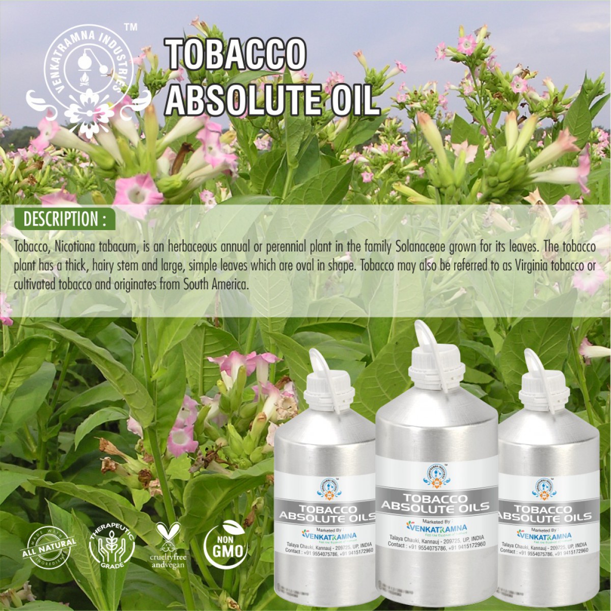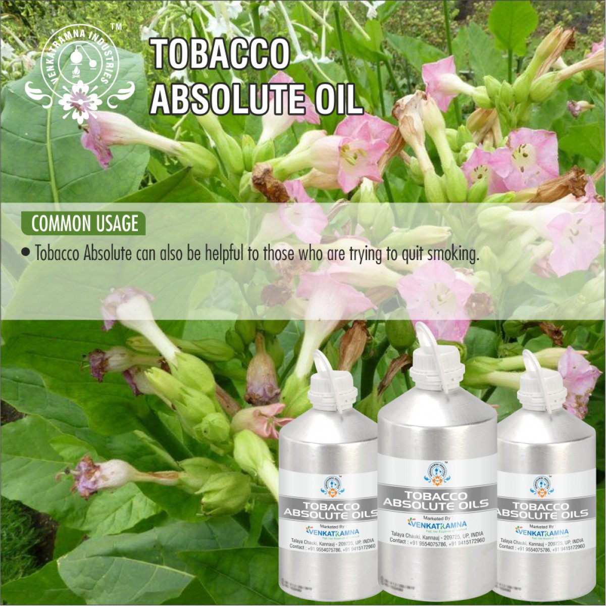 The tobacco absolute oil has been used for centuries for alleviating different skin conditions. The absolute oil of tobacco is a good source of skin-friendly Vitamin C which is proven quite effective in alleviating the skin conditions like burns, eczema, rashes, and other skin infections. Regular use of tobacco absolute oil with any carrier oil over the skin will make it looks smooth, soft, supple, and radiant throughout a day.