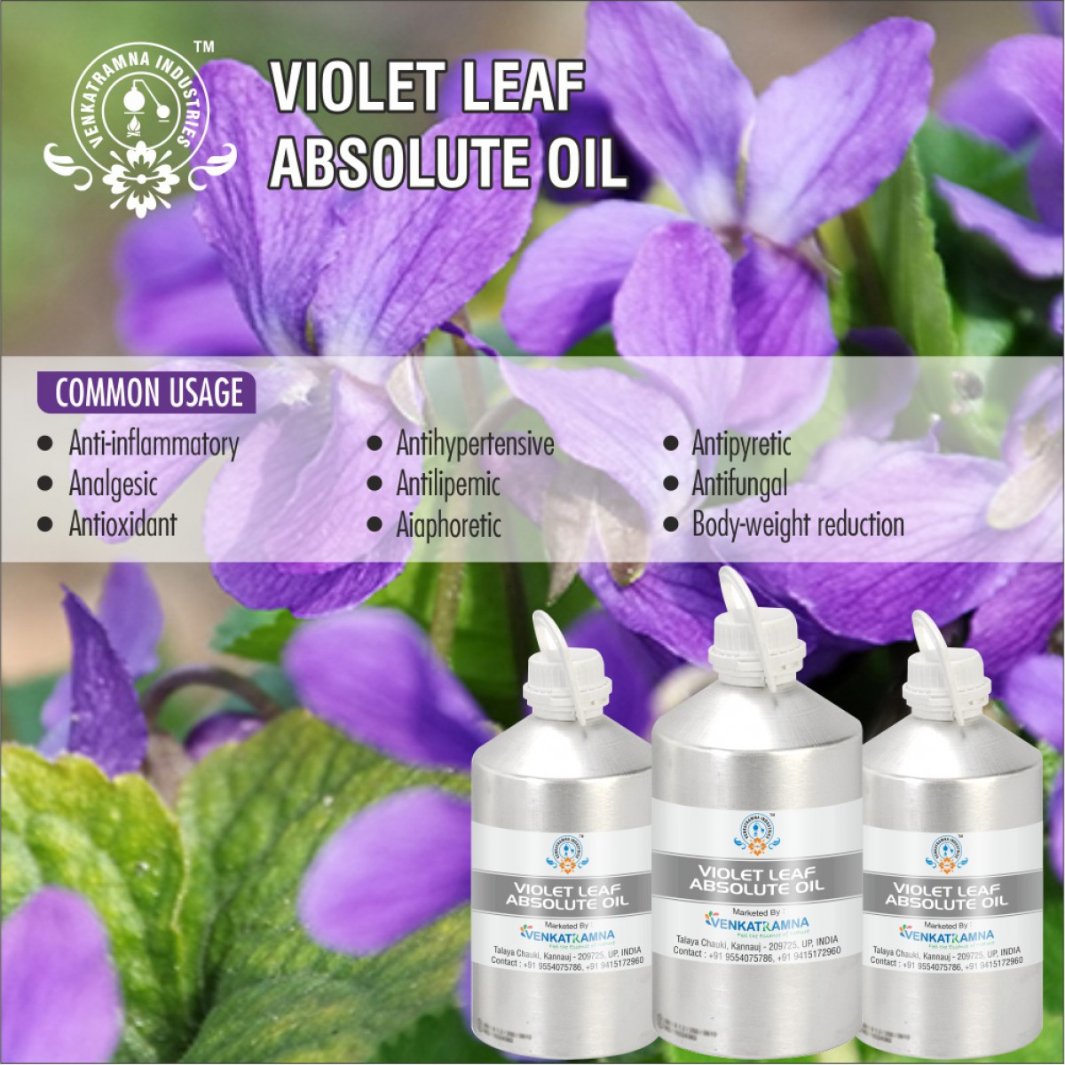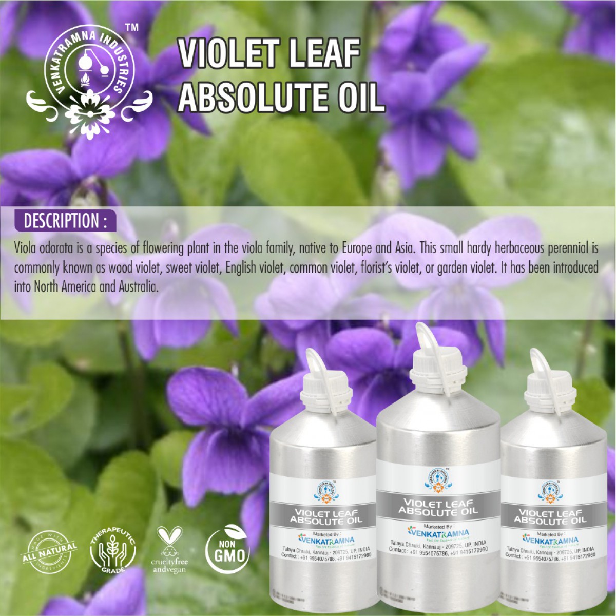 The Viola plant (Viola odorata) is a tiny perennial plant grown mostly for its ornamental dark violet or white flowers. It is native to Europe and Asia, but has also been introduced to North America and Australasia. It is also known as Sweet Violet, English Violet, Common Violet, or Garden Violet. The sweet, unmistakable fragrance of Violet has been popular for centuries, particularly in the late Victorian period and it has long been used as an ingredient in many cosmetics and perfumes. Both the leaf and flowers also have a long tradition of use in herbal medicine. It has historically been used to treat congestive pulmonary disorders and sensitive skin conditions. In India, where it is known as Banafsha, it is commonly used to treat sore throats and tonsillitis. Its scent was also believed to comfort and strengthen the heart during times of grief. Violet Leaf Absolute essential oil has an earthy, leafy, herbaceous aroma with subtle floral notes. It is solvent extracted from the leaves of the plant resulting in a very thick, green substance that is almost solid at room temperature (needs warming in order to make the oil mobile). In modern aromatherapy the oil is used for its soothing and comforting effect on both the mind, skin and body. As with most expensive absolutes and essential oils, Violet Leaf is also used as an ingredient in high end perfumes.