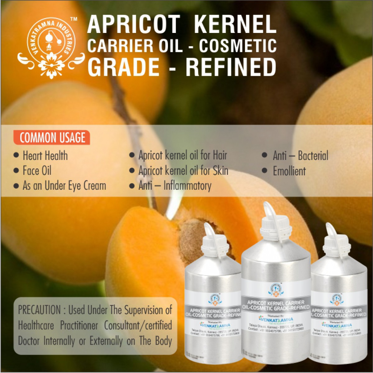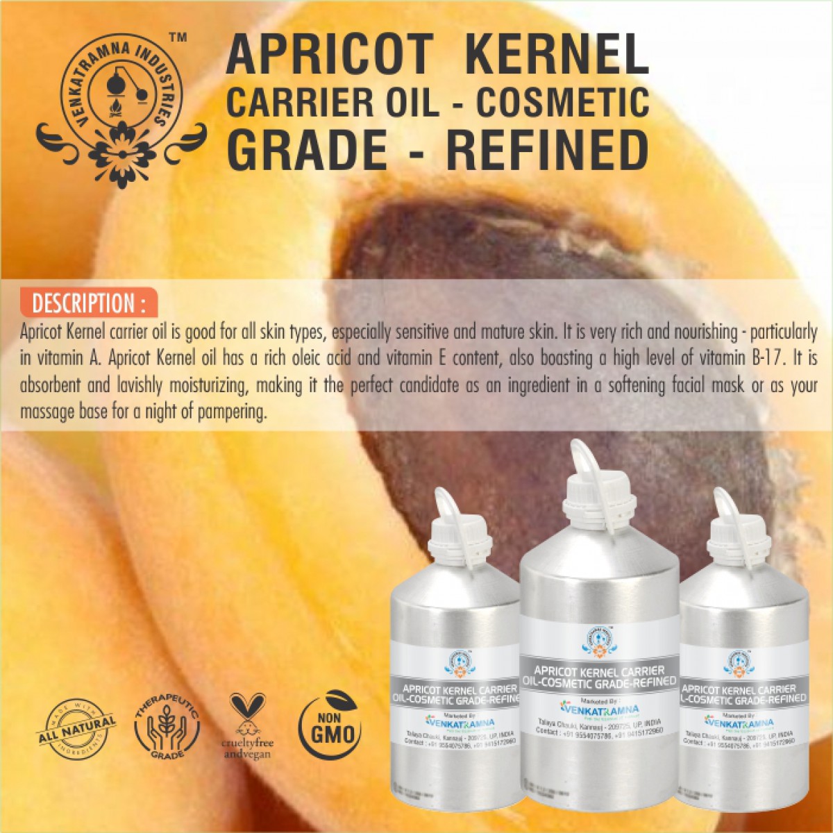 To be used in aromatherapy, it is recommended that the oil is obtained through cold pressing. In this process, the oil is extracted by crushing the plants. Users claim that the fragile nutrients in the oil can be damaged if they are extracted with heat. Venkatramna’s carrier Oils are extracted from the Cold Pressed method to retain their properties.