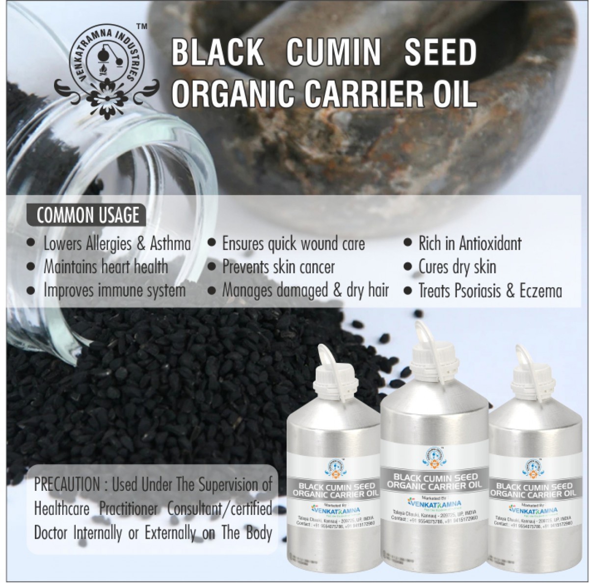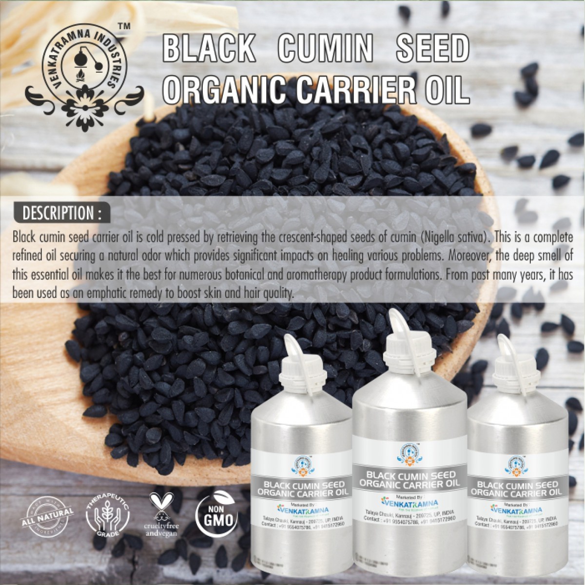 To be used in aromatherapy, it is recommended that the oil is obtained through cold pressing. In this process, the oil is extracted by crushing the plants. Users claim that the fragile nutrients in the oil can be damaged if they are extracted with heat. Venkatramna’s carrier Oils are extracted from the Cold Pressed method to retain their properties.