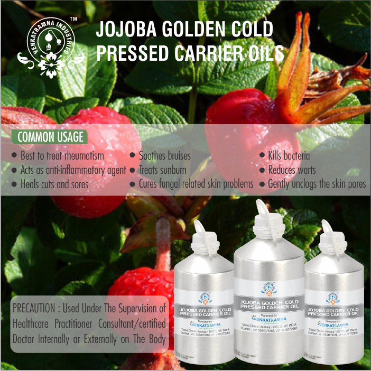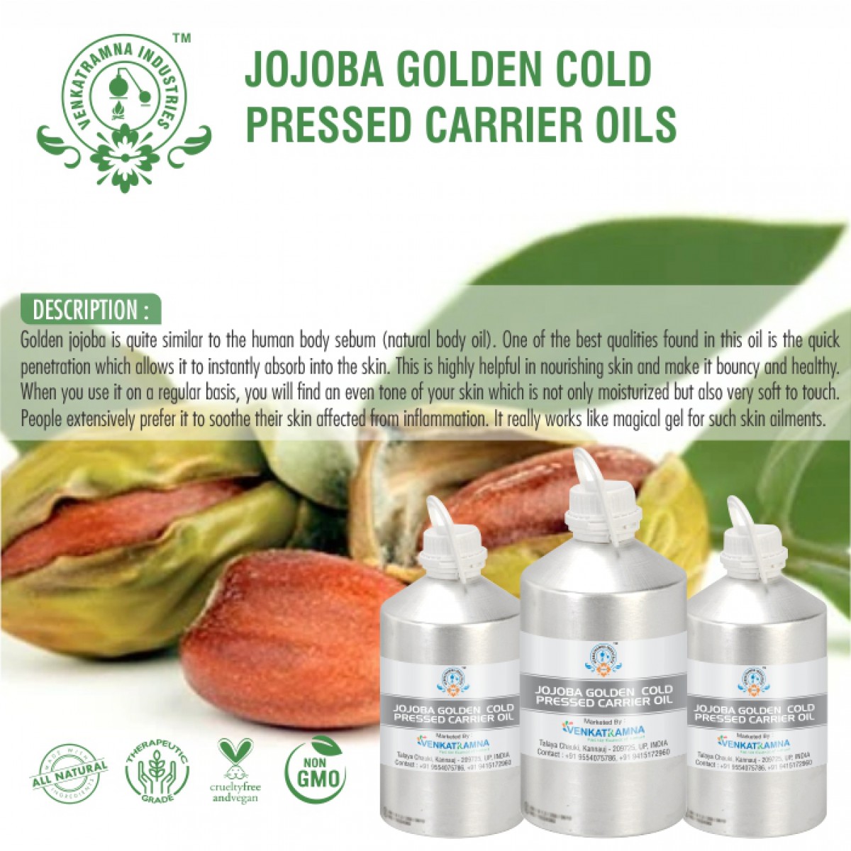 To be used in aromatherapy, it is recommended that the oil is obtained through cold pressing. In this process, the oil is extracted by crushing the plants. Users claim that the fragile nutrients in the oil can be damaged if they are extracted with heat. Venkatramna’s carrier Oils are extracted from the Cold Pressed method to retain their properties.