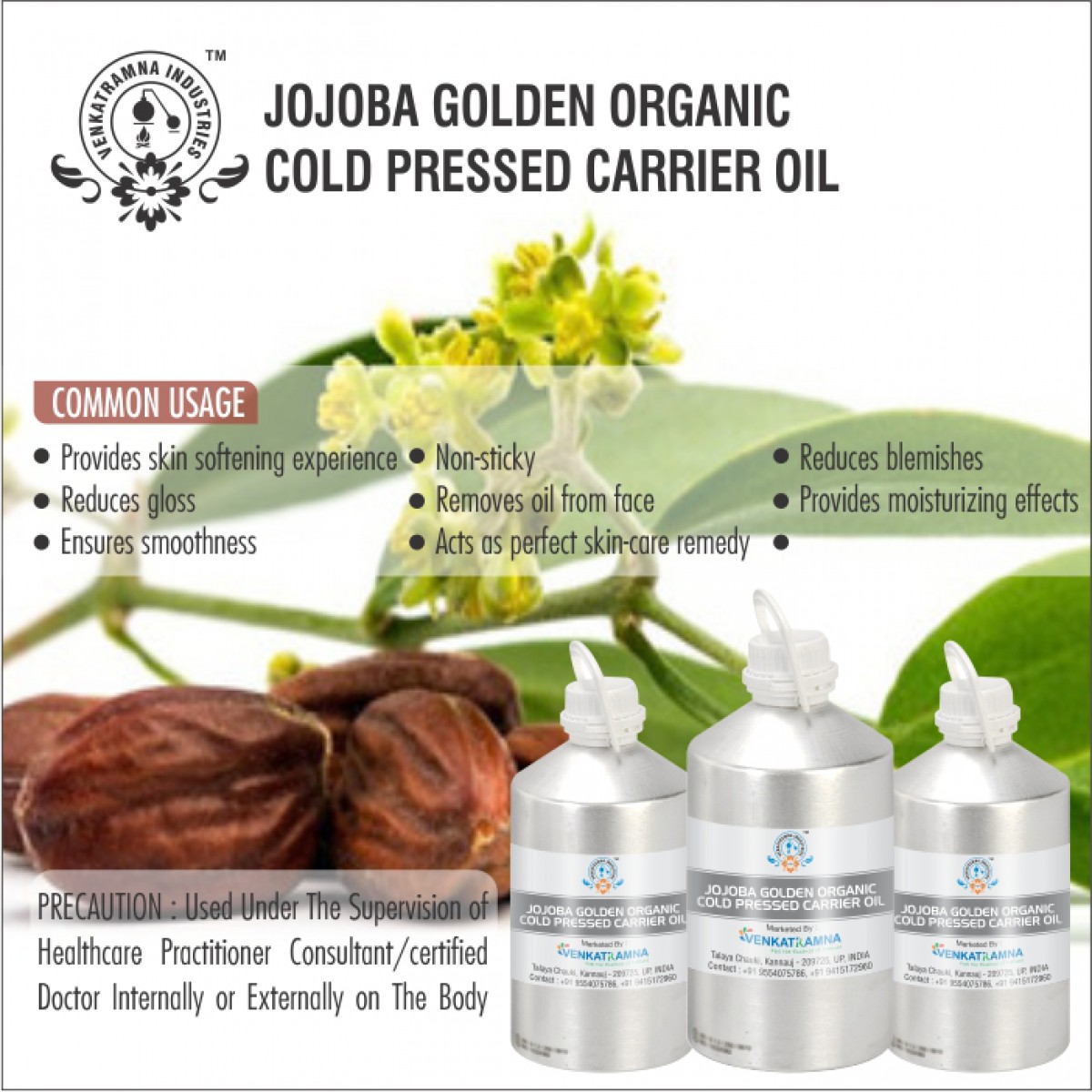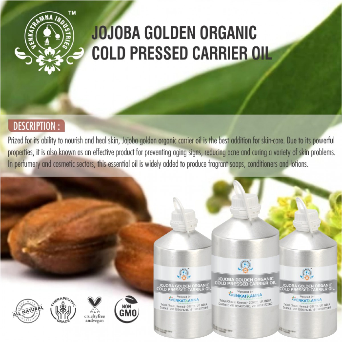 To be used in aromatherapy, it is recommended that the oil is obtained through cold pressing. In this process, the oil is extracted by crushing the plants. Users claim that the fragile nutrients in the oil can be damaged if they are extracted with heat. Venkatramna’s carrier Oils are extracted from the Cold Pressed method to retain their properties.