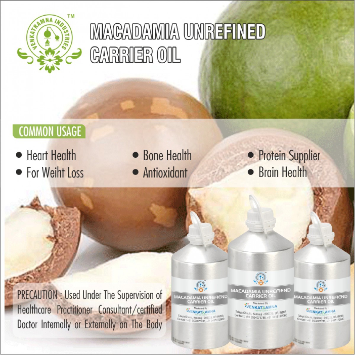 To be used in aromatherapy, it is recommended that the oil is obtained through cold pressing. In this process, the oil is extracted by crushing the plants. Users claim that the fragile nutrients in the oil can be damaged if they are extracted with heat. Venkatramna’s carrier Oils are extracted from the Cold Pressed method to retain their properties.